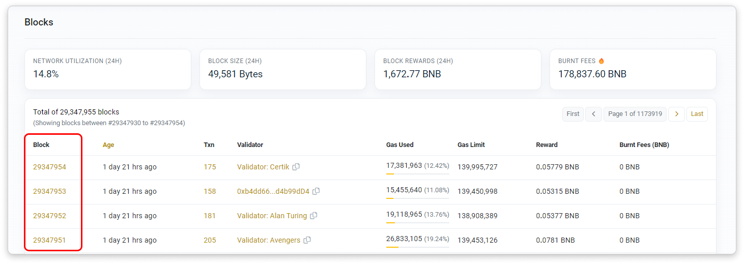 - Transactions: The number of transactions in the block. Contract internal transactions refer to transactions that are created from contract executions and transact BNB.
