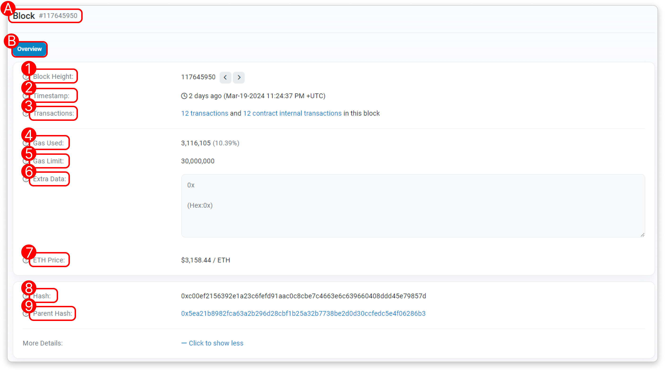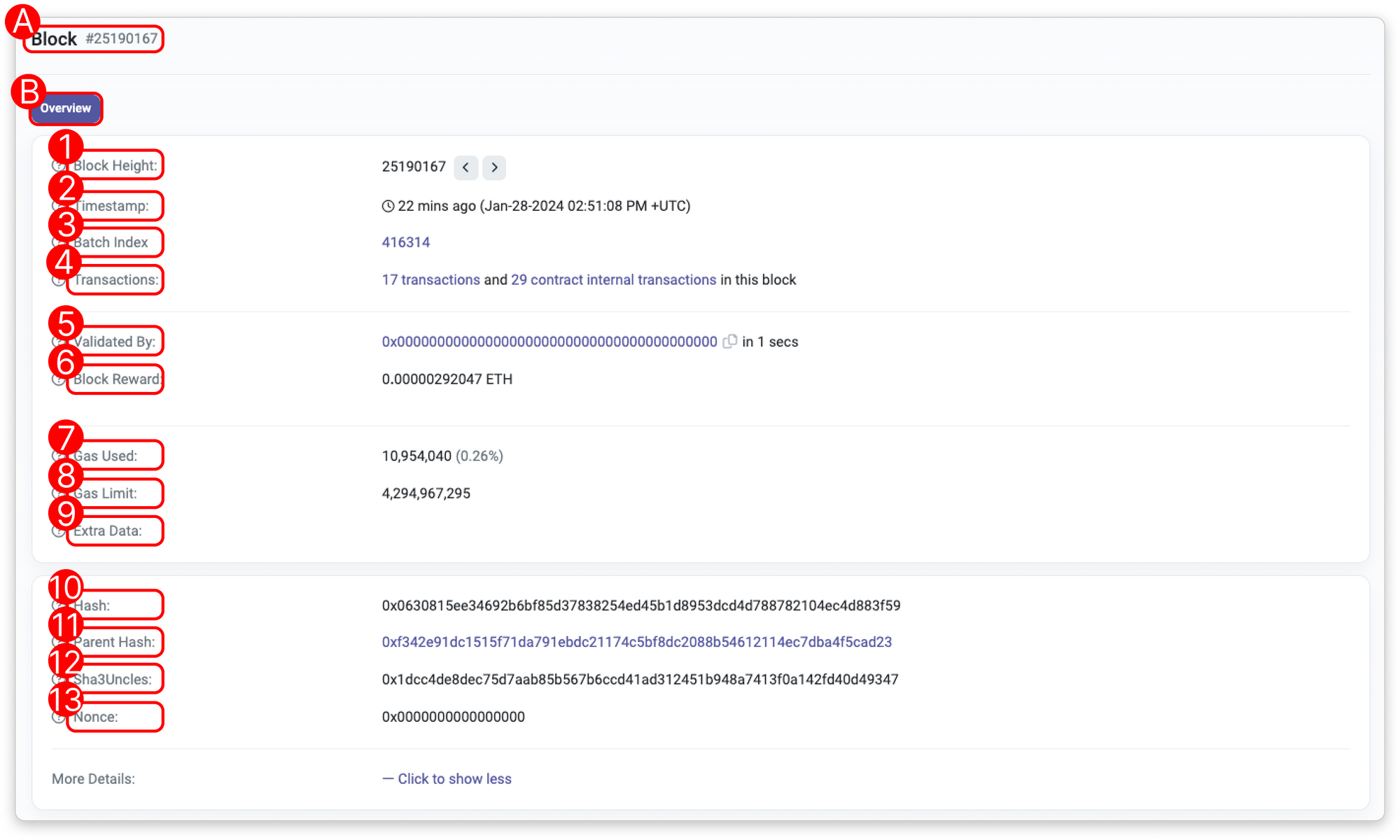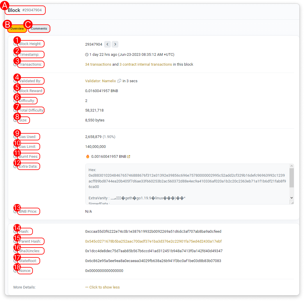 - Block Height: The block height, also known as block number, which indicates the position of a particular block in the blockchain.