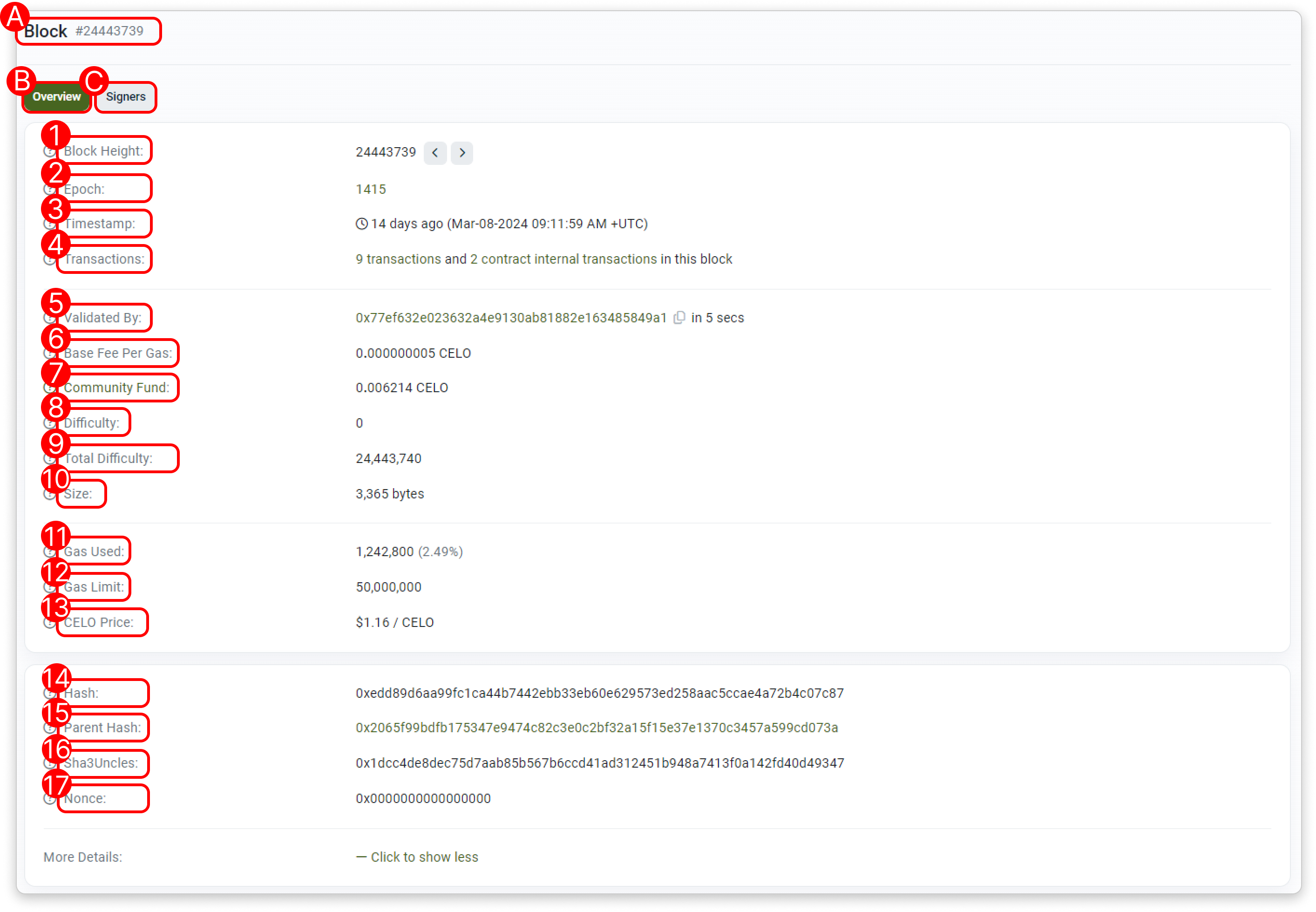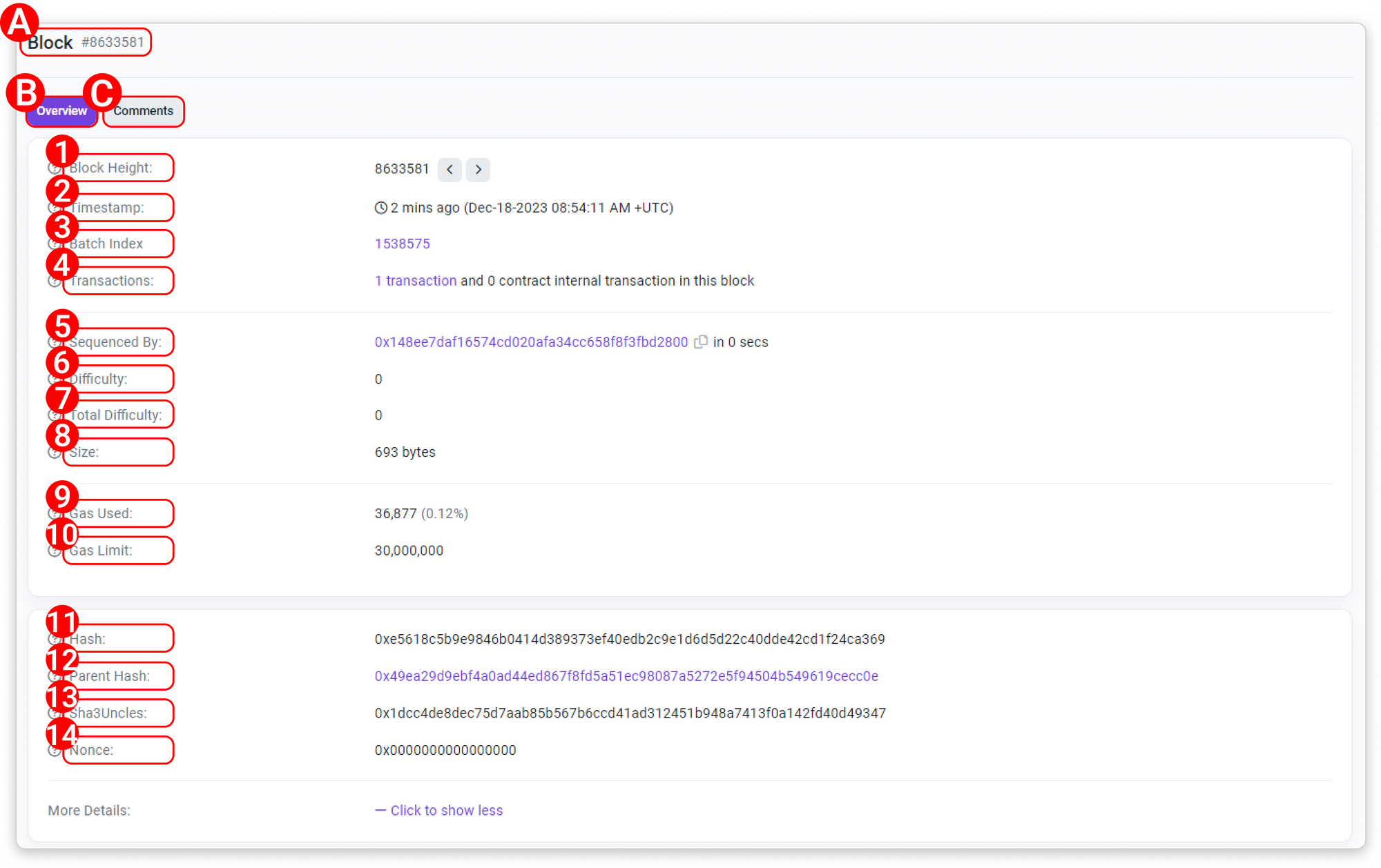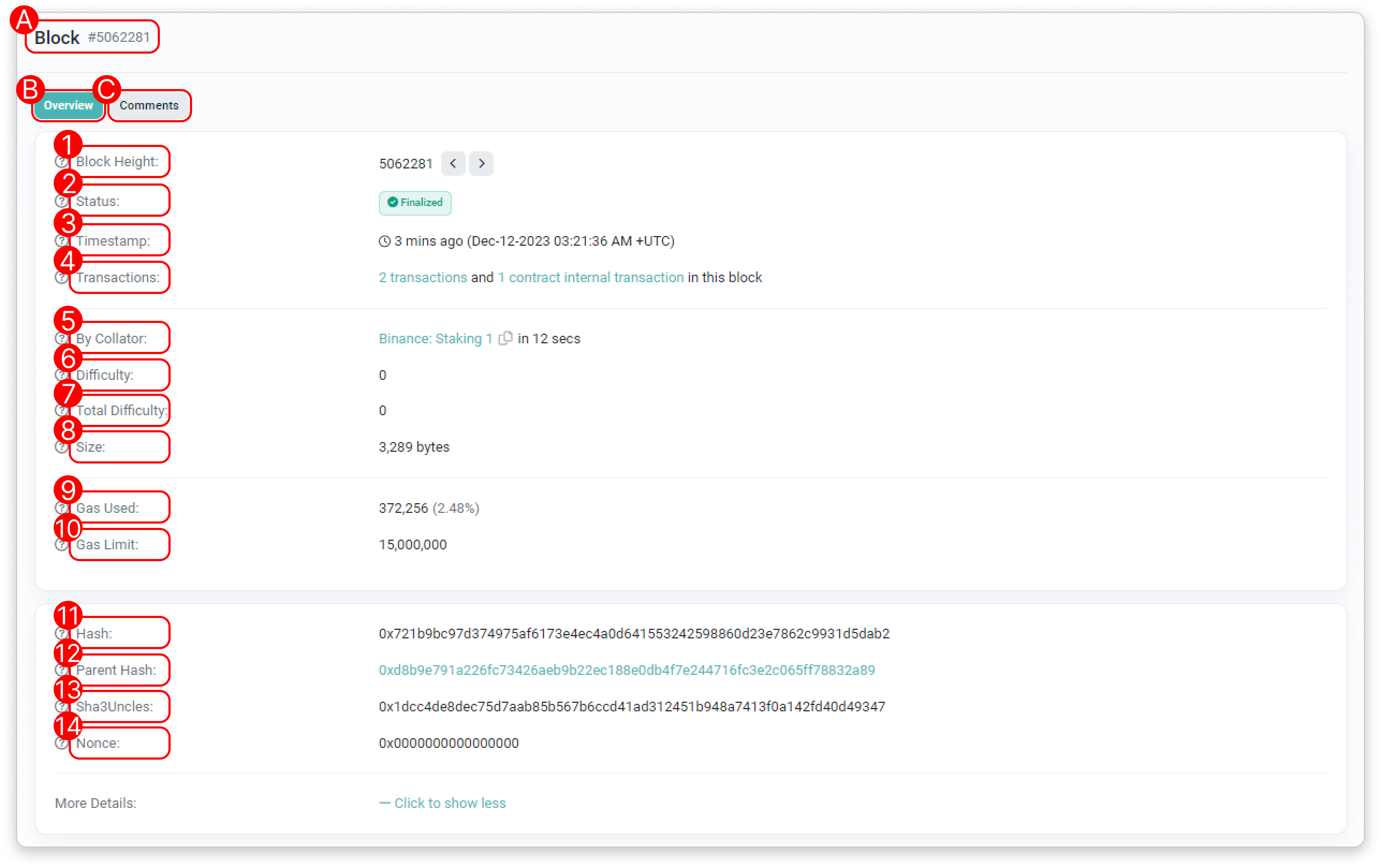 - Block Height: The block height, also known as block number, which indicates the position of a particular block in the blockchain.