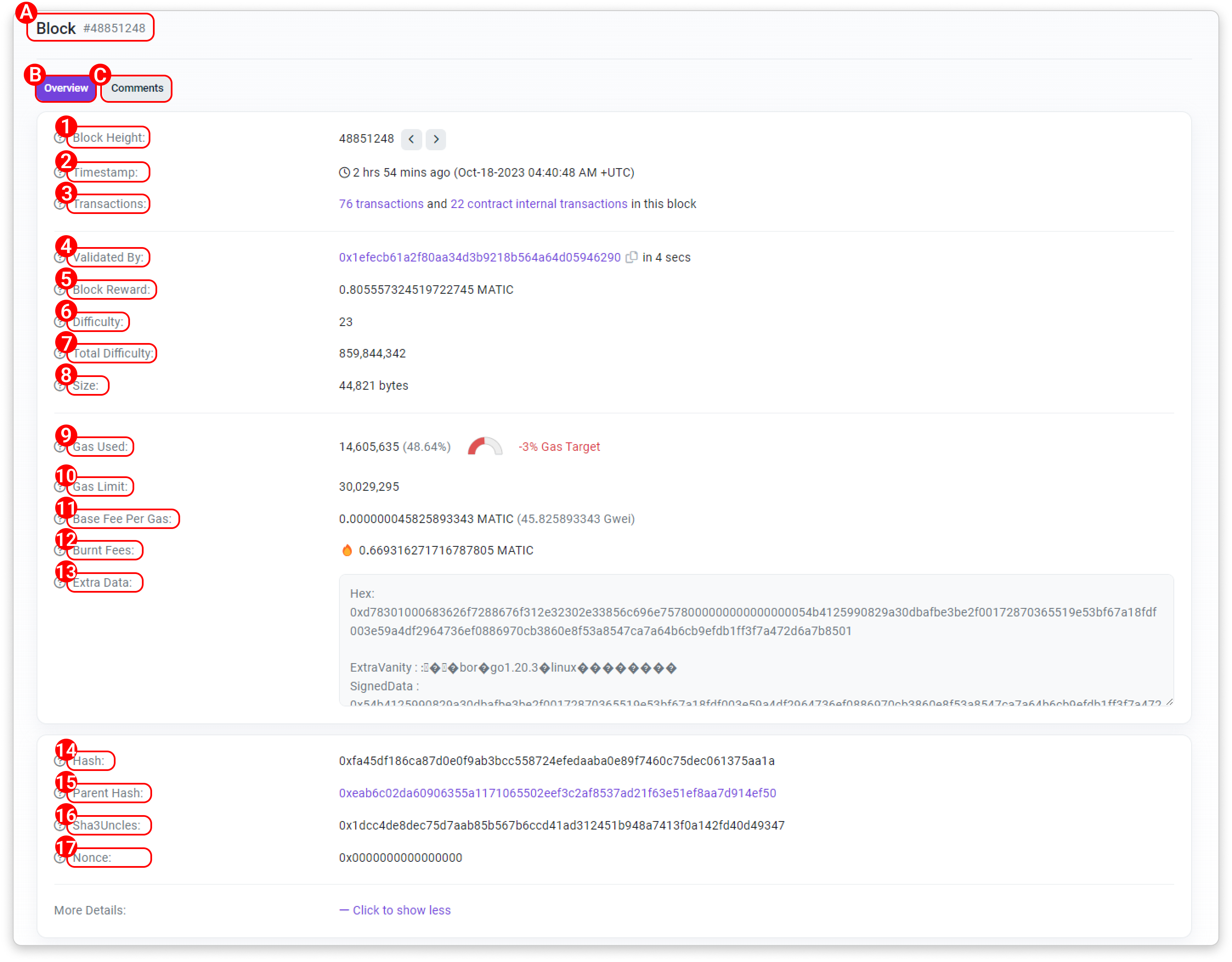 - Parent Hash: The hash of the block from which this block was generated, also known as its parent block.