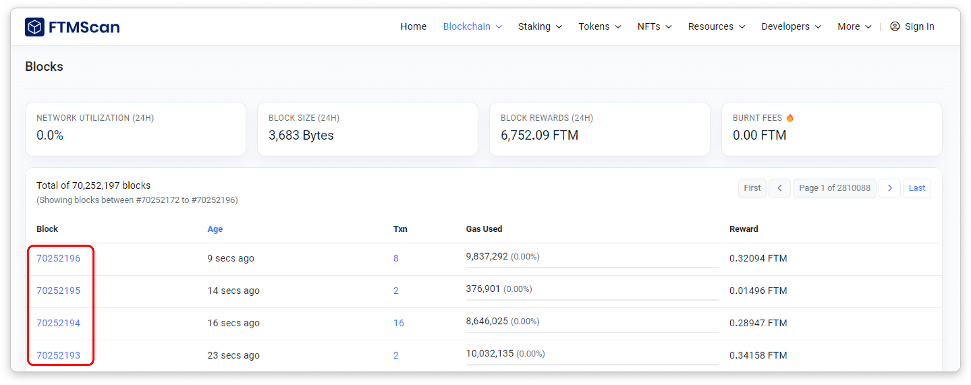 - Transactions: The number of transactions in the block. Contract internal transactions refer to transactions that are created from contract executions and transact FTM.