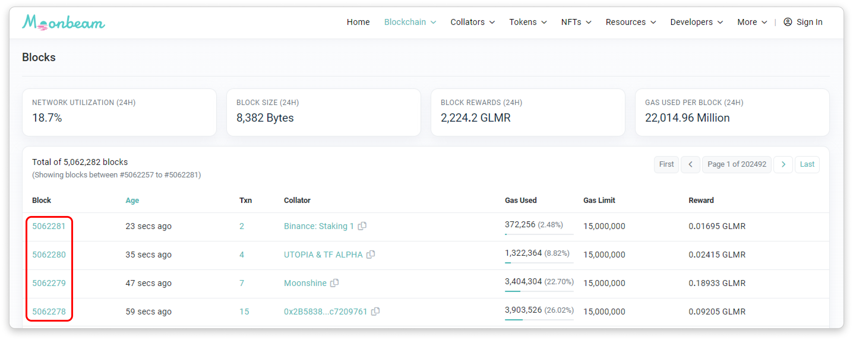 - Transactions: The number of transactions in the block. Contract internal transactions refer to transactions that are created from contract executions and transact GLMR.