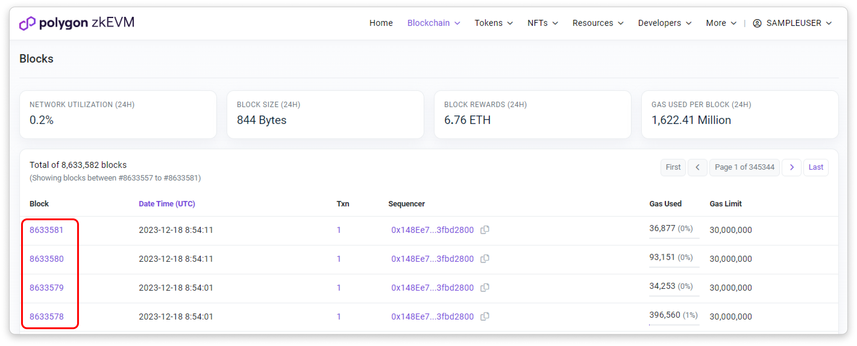 - Sequenced By: Shows which sequencer received the reward for successfully building the block.