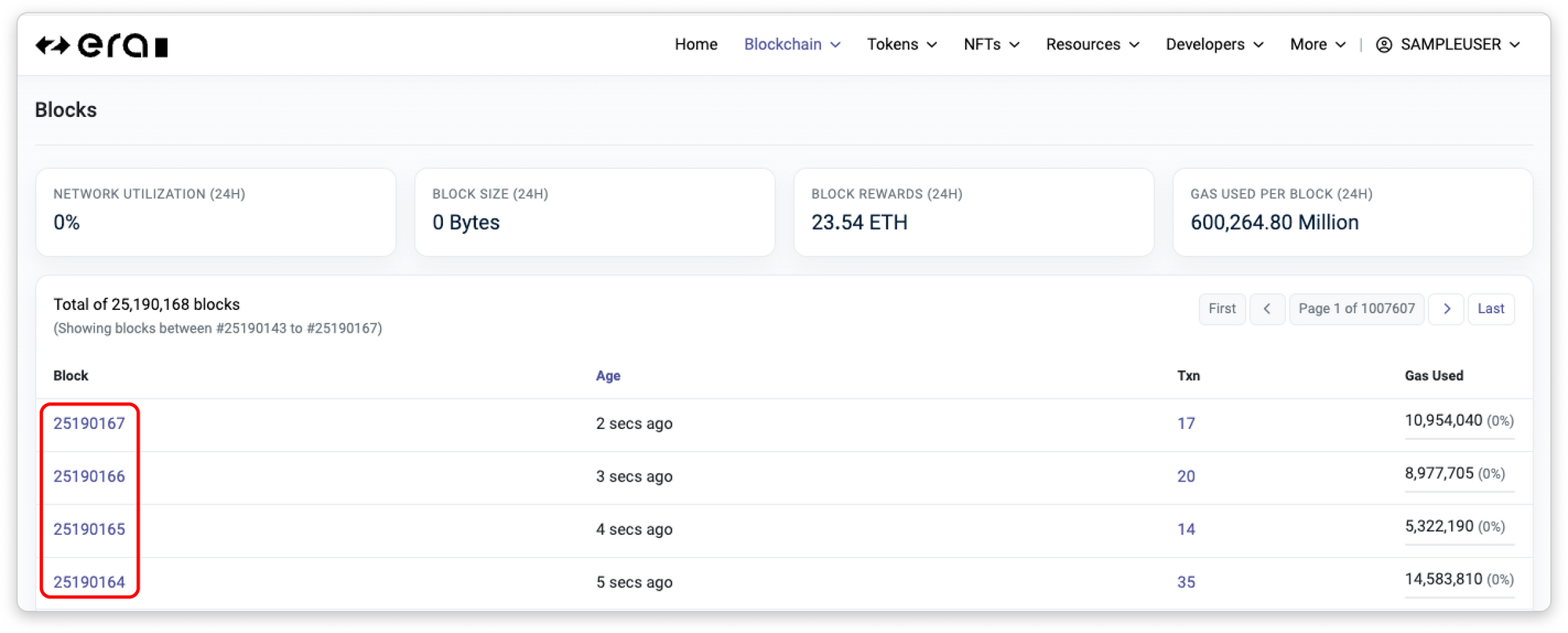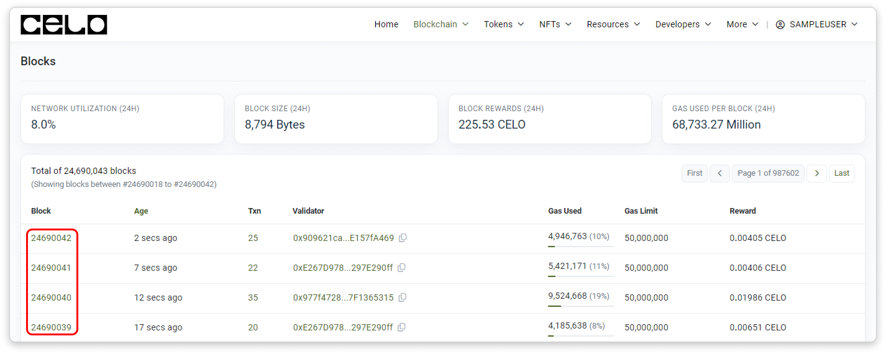 - Gas Used: The total gas used in the block. The gas used percentage (out of total gas limit) is also included.