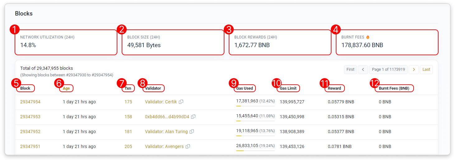 - Reward: The total block reward received by the validator for including the block in the blockchain.