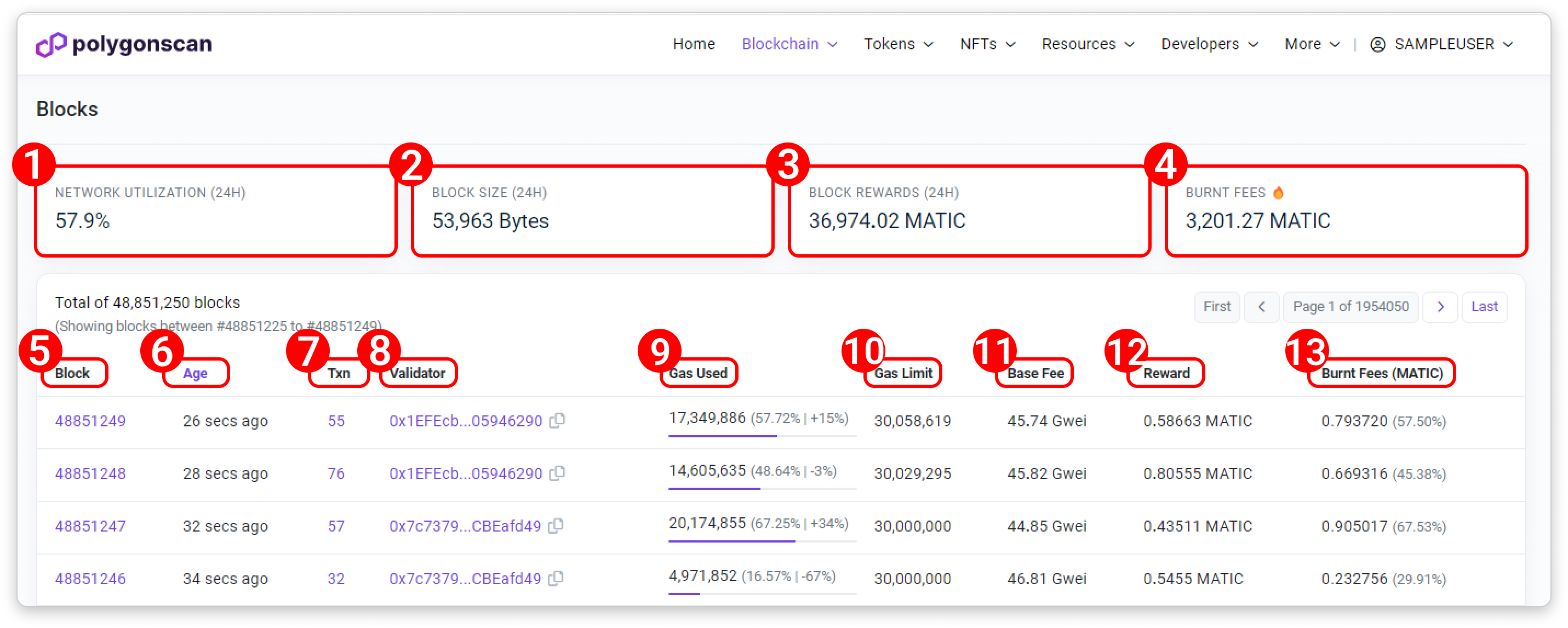 - Gas Used: The total gas used in the block. The gas used percentage (out of the total gas limit) was also included.