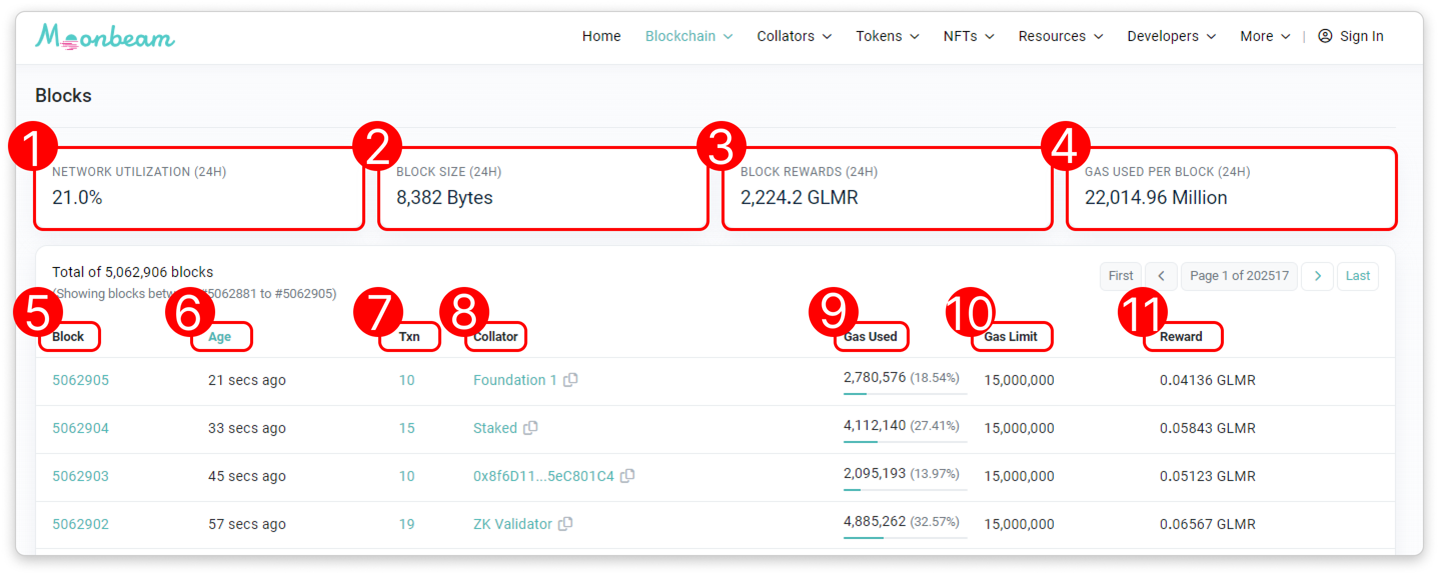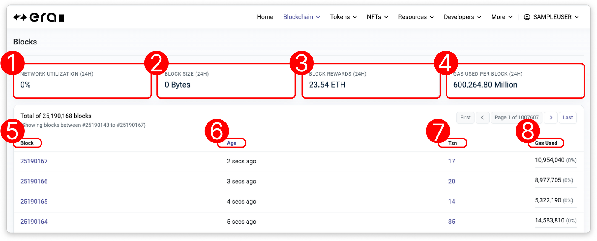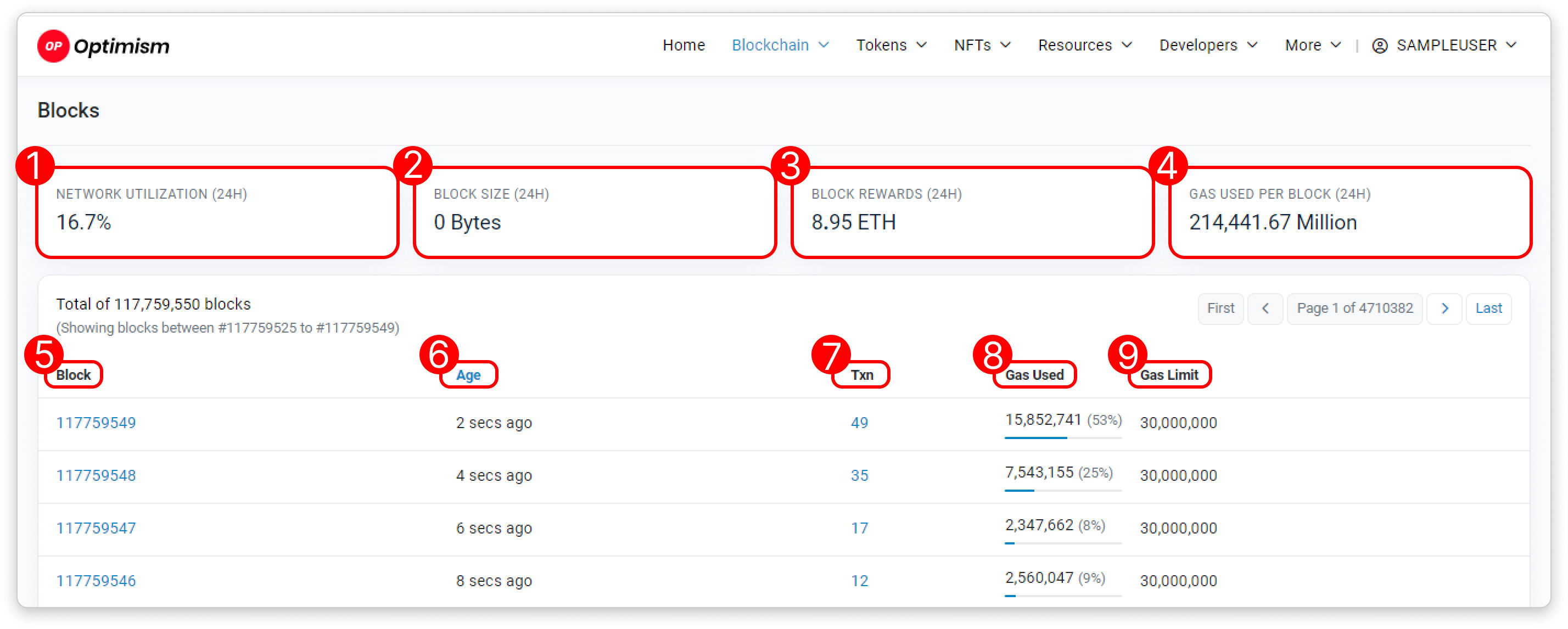 - Network Utilization: The average percentage of gas limit used per block based on the blocks listed on the current page.