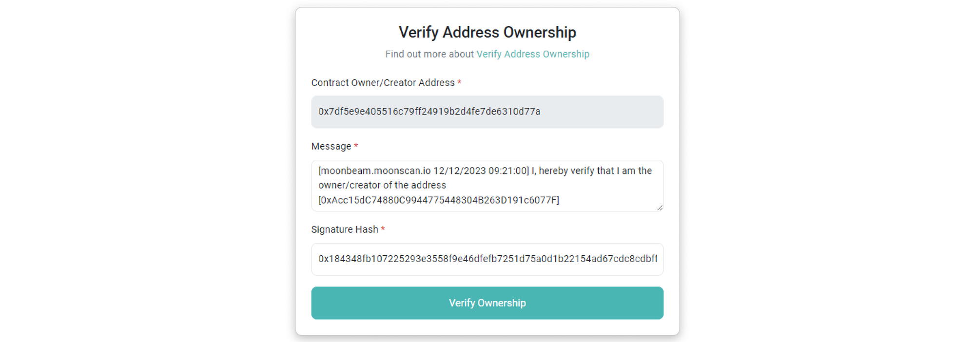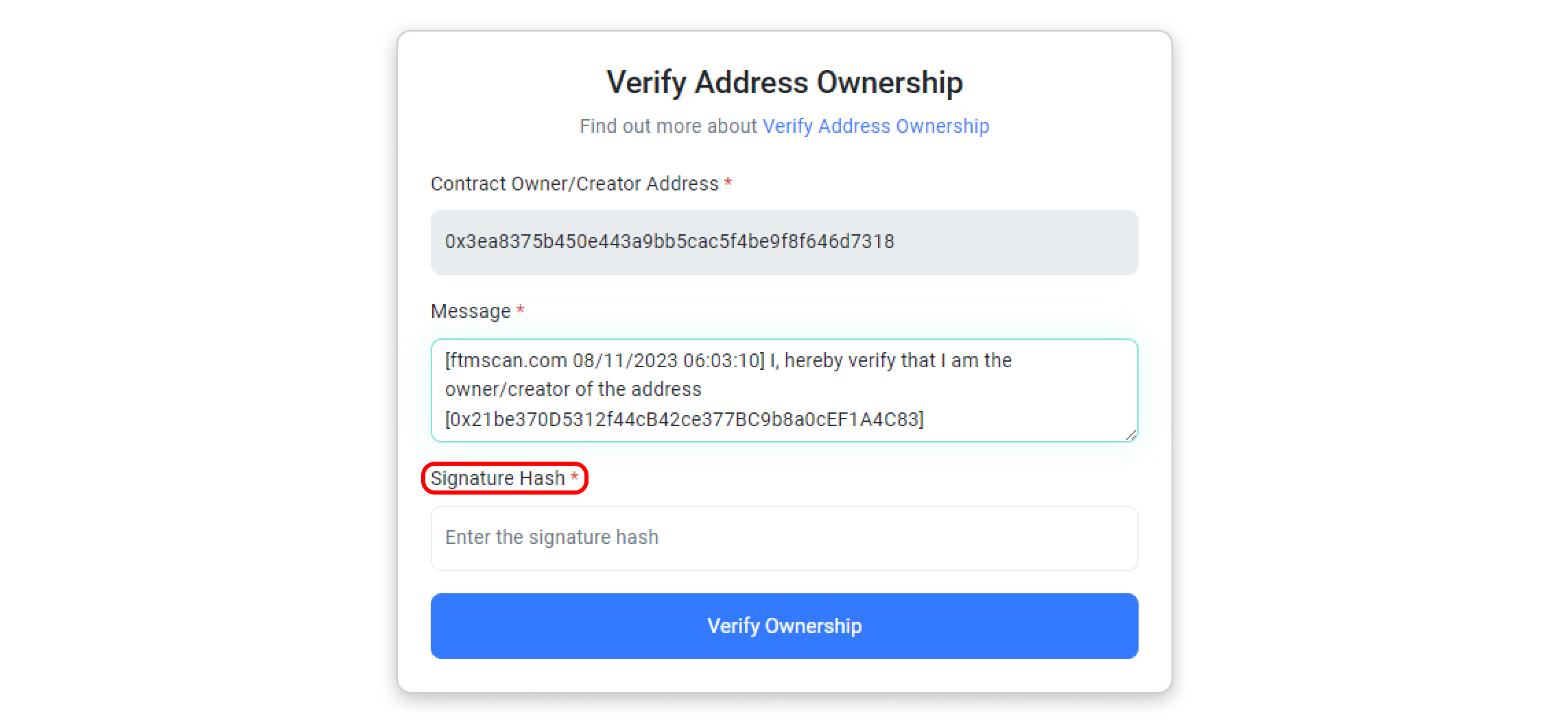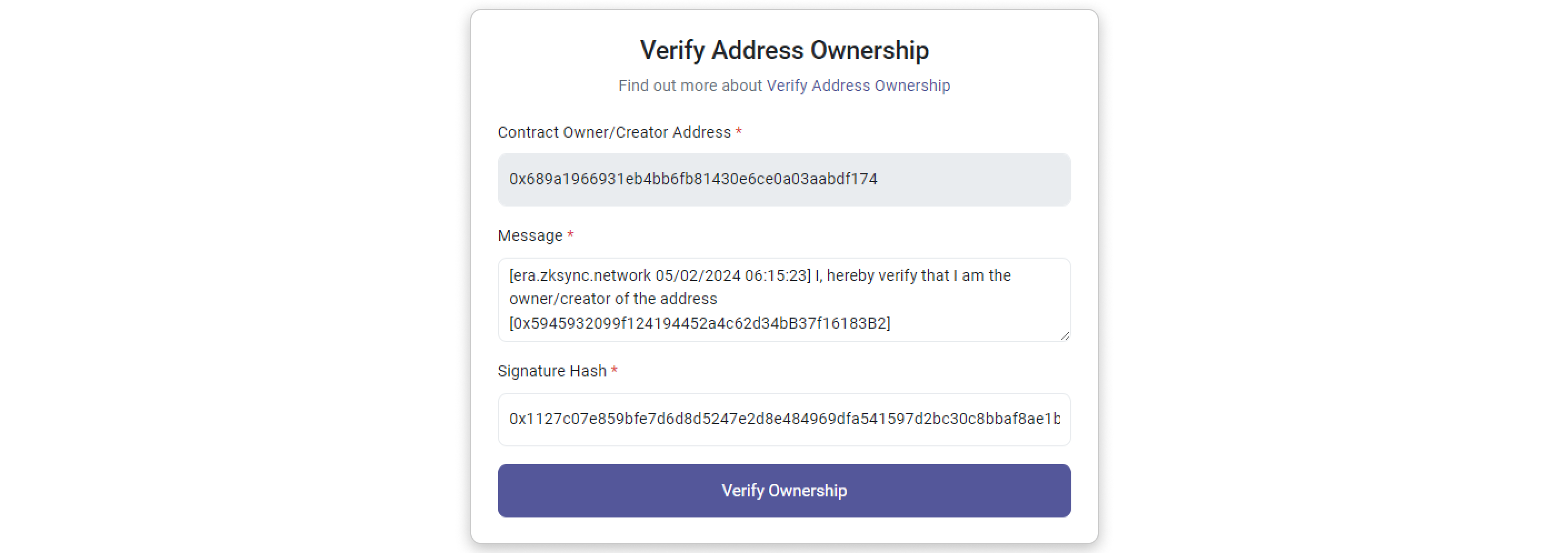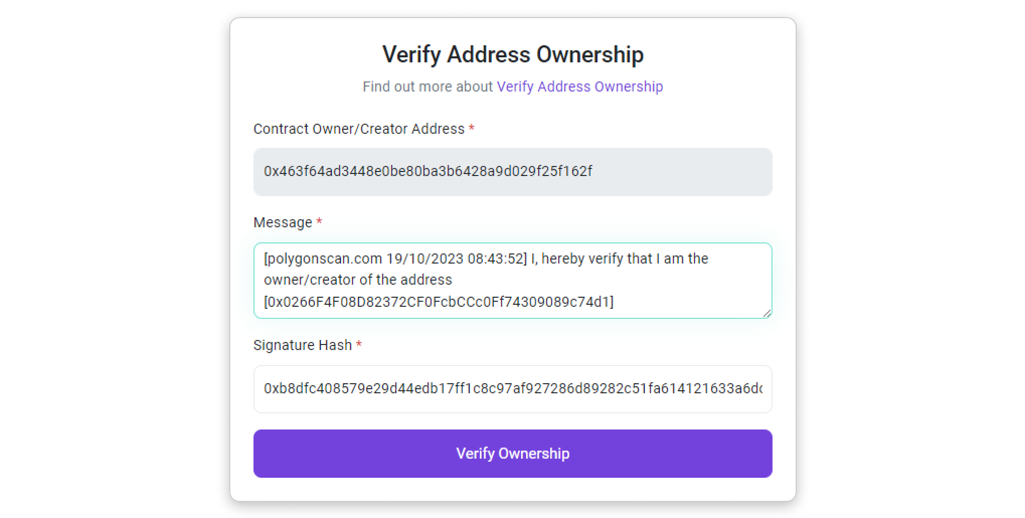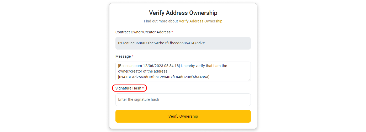 Step 5: You will be directed to a page where the address, message, and signature hash are prefilled. Click on Verify Ownership to proceed.