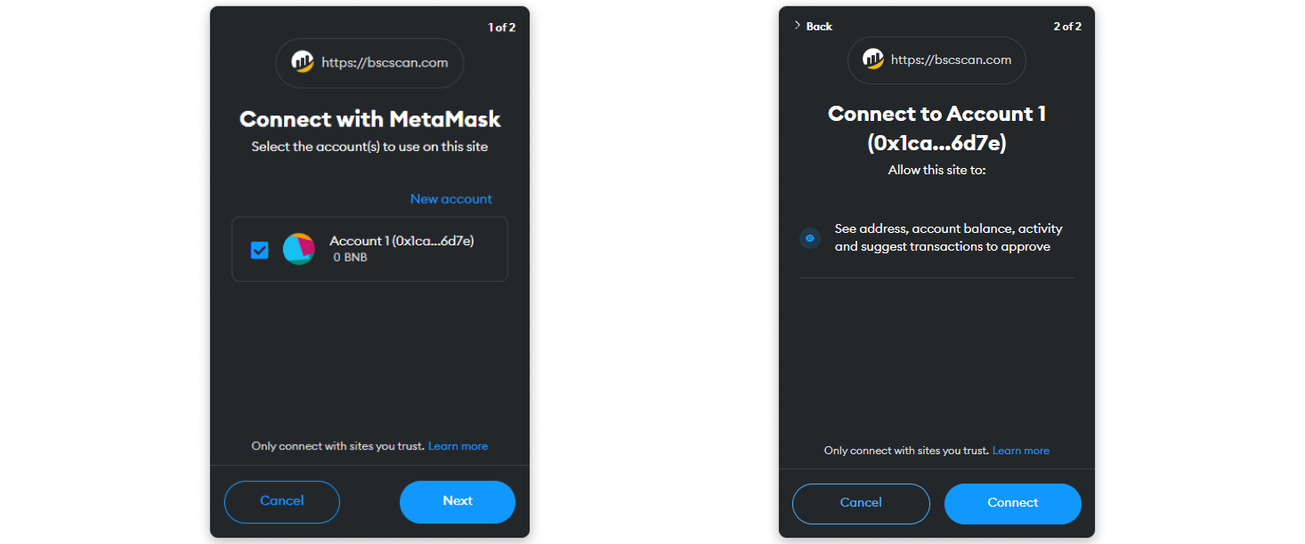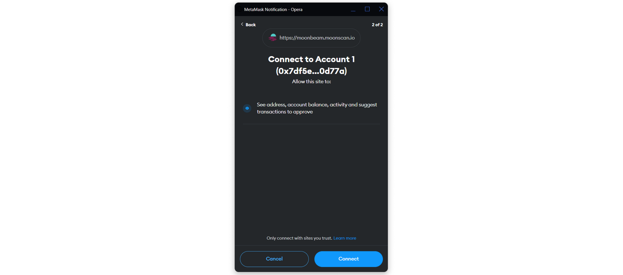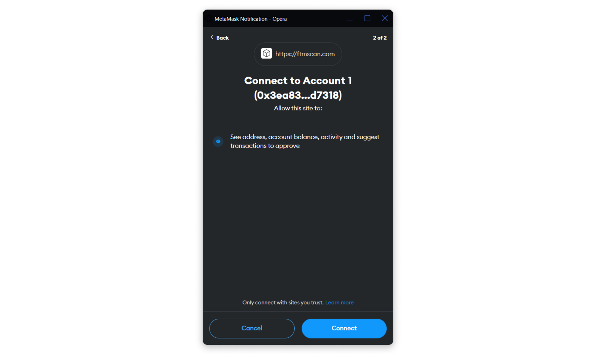 Step 2: Once logged in, choose the account you want to connect to fraxscan.com and click Connect to proceed with signing the message.