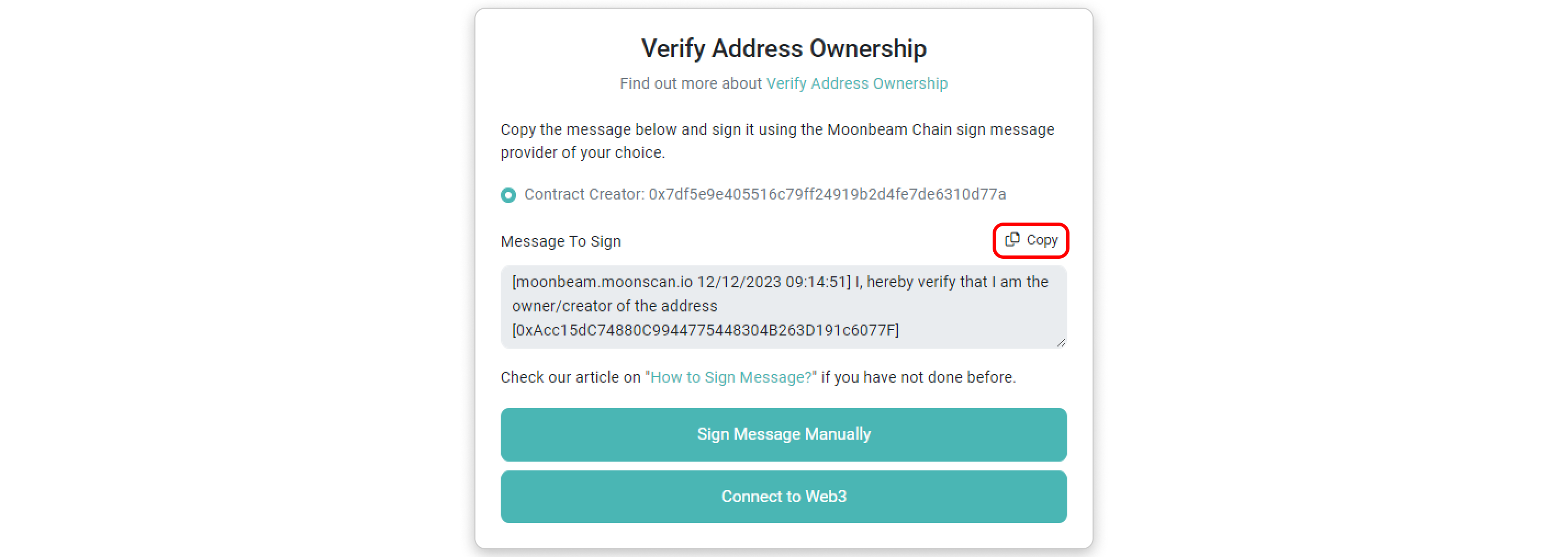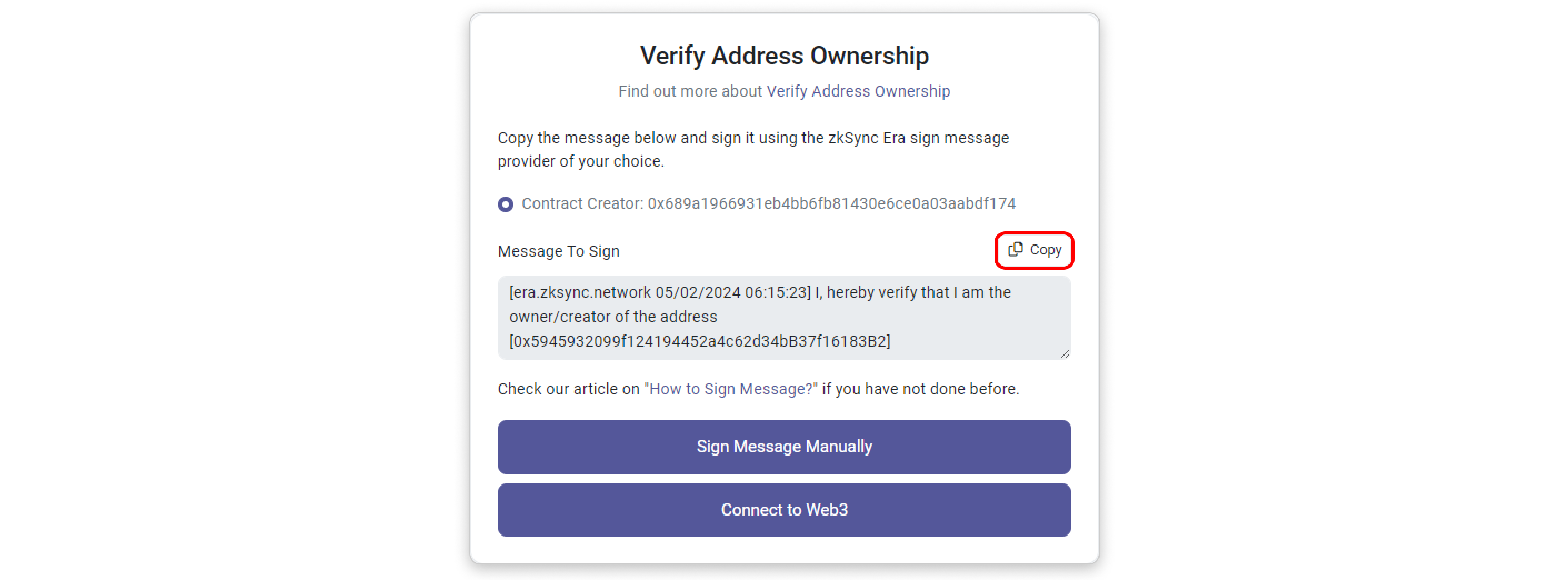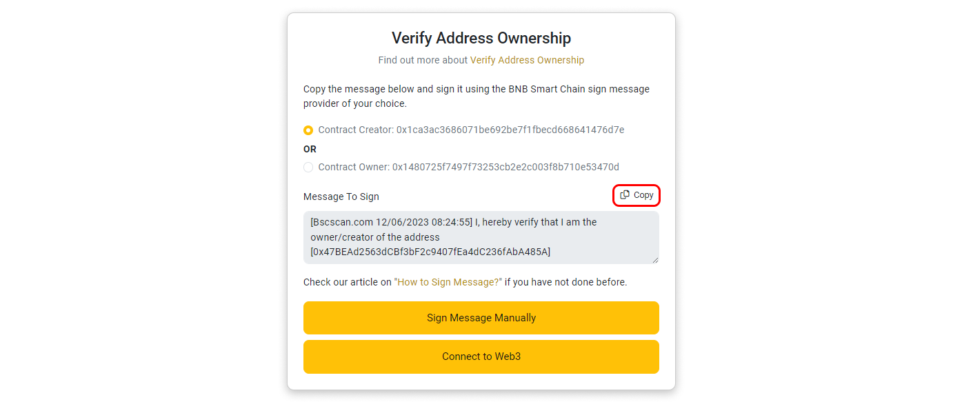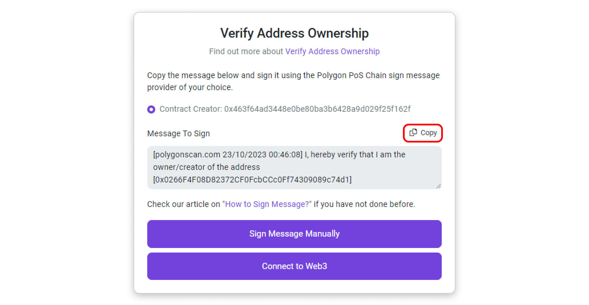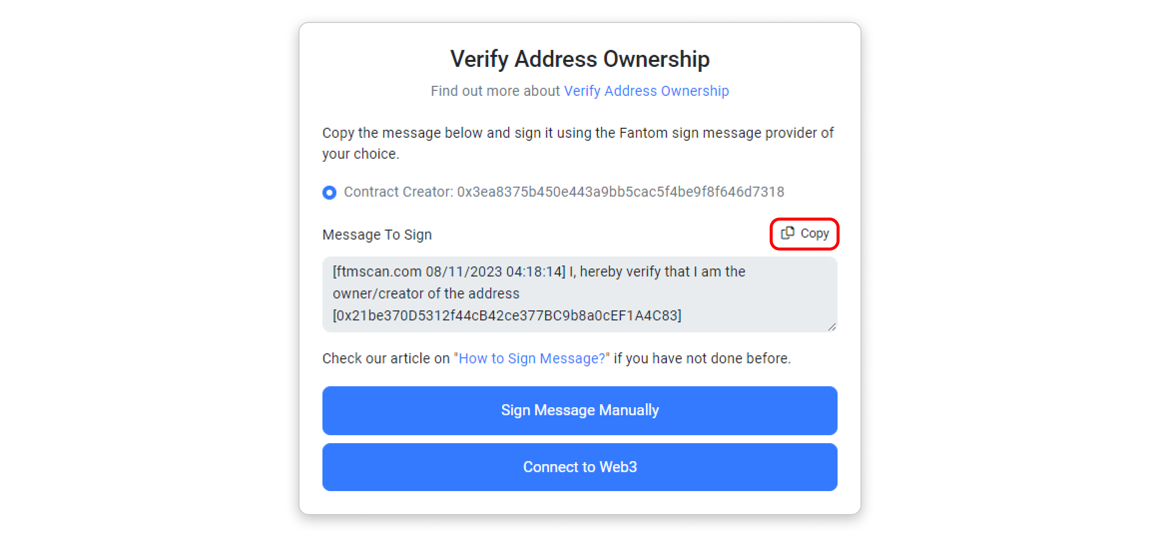 Step 1: Copy the message template provided inside the box by clicking the highlighted button in the screenshot below. Then, click Sign Message Manually