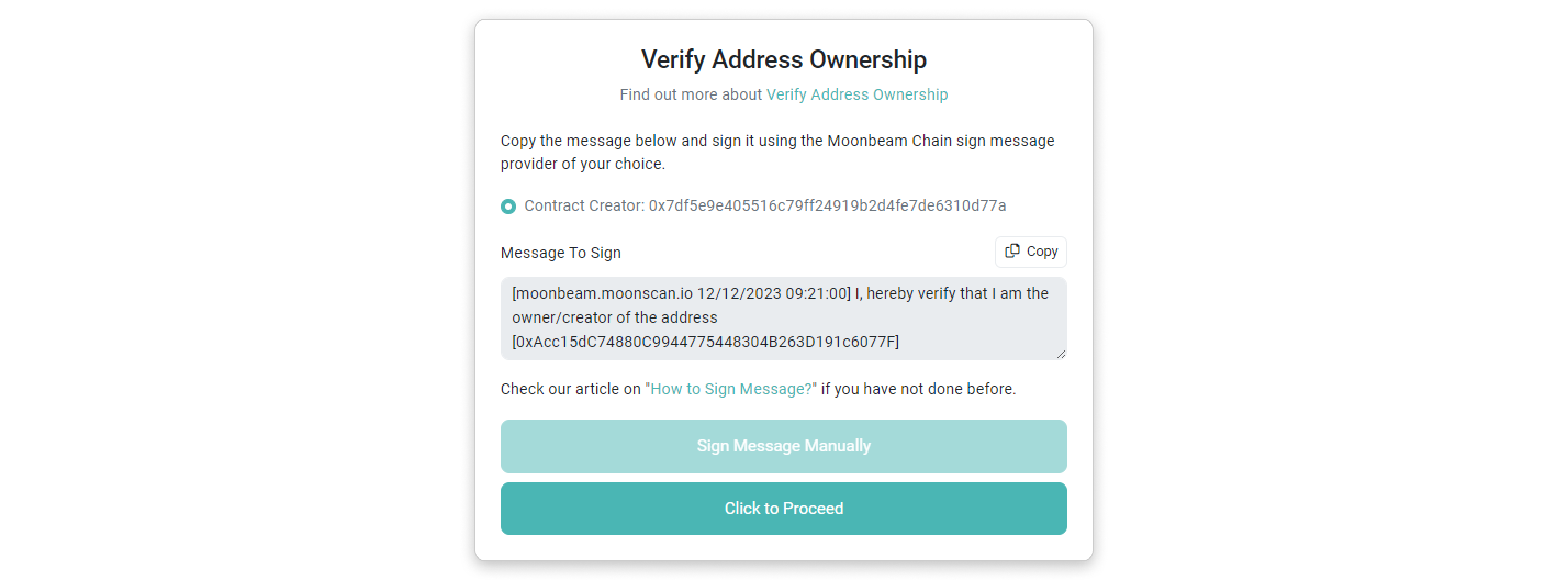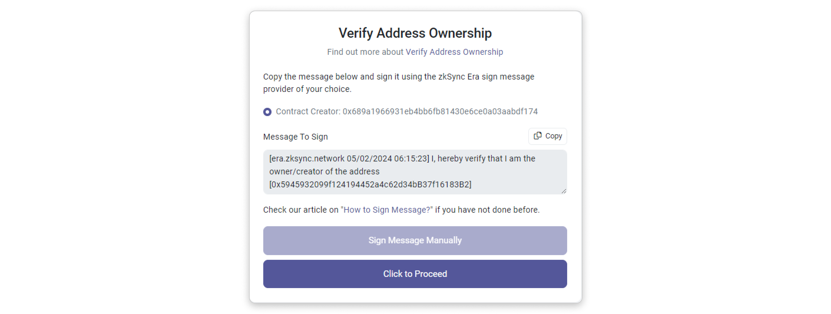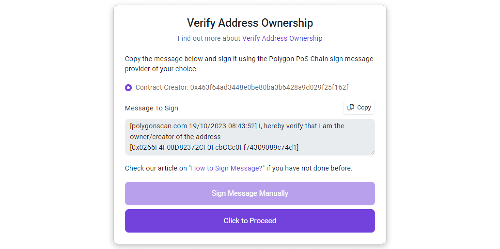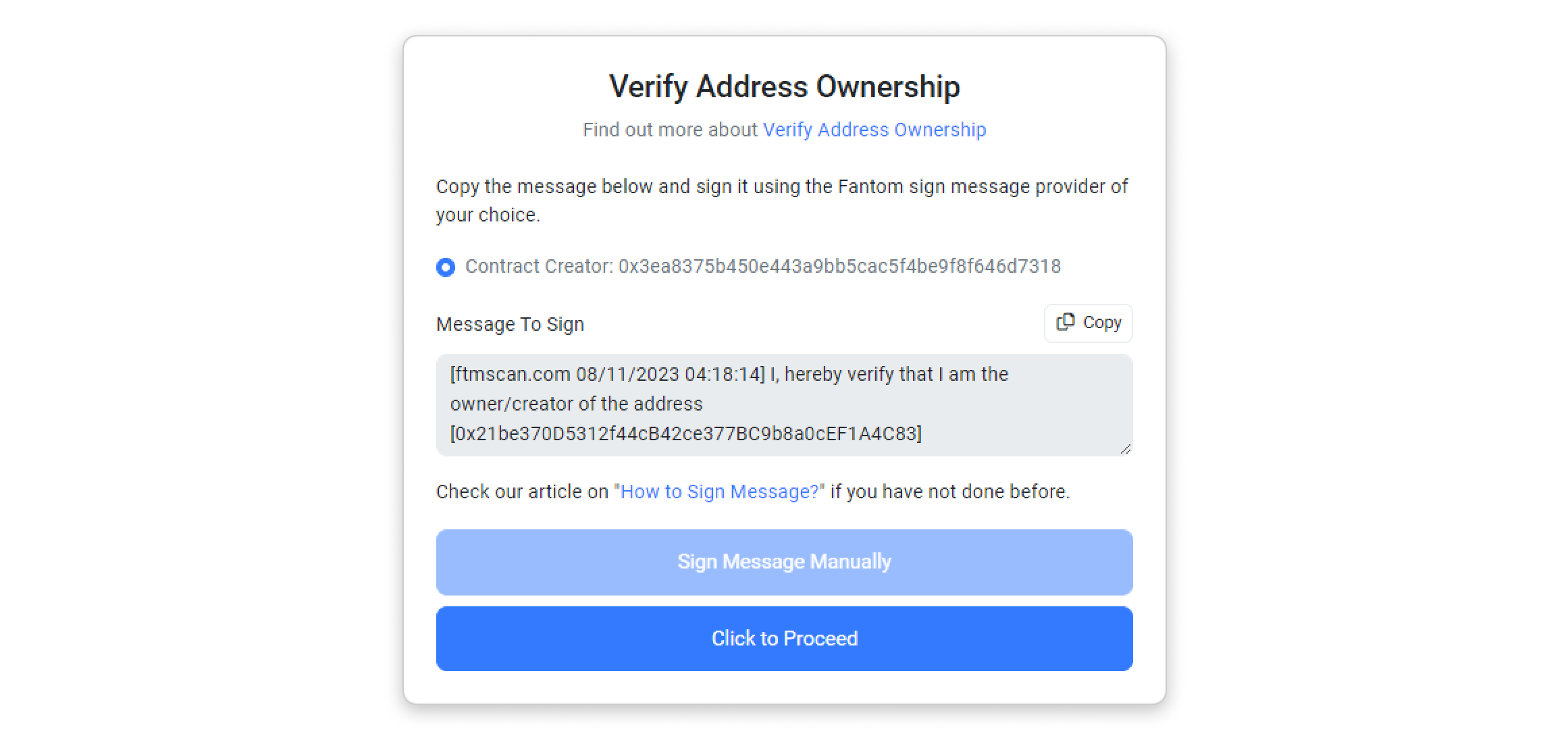 Step 1: Copy the message template provided inside the box by clicking the highlighted button in the screenshot below. Then, click Sign Message Manually