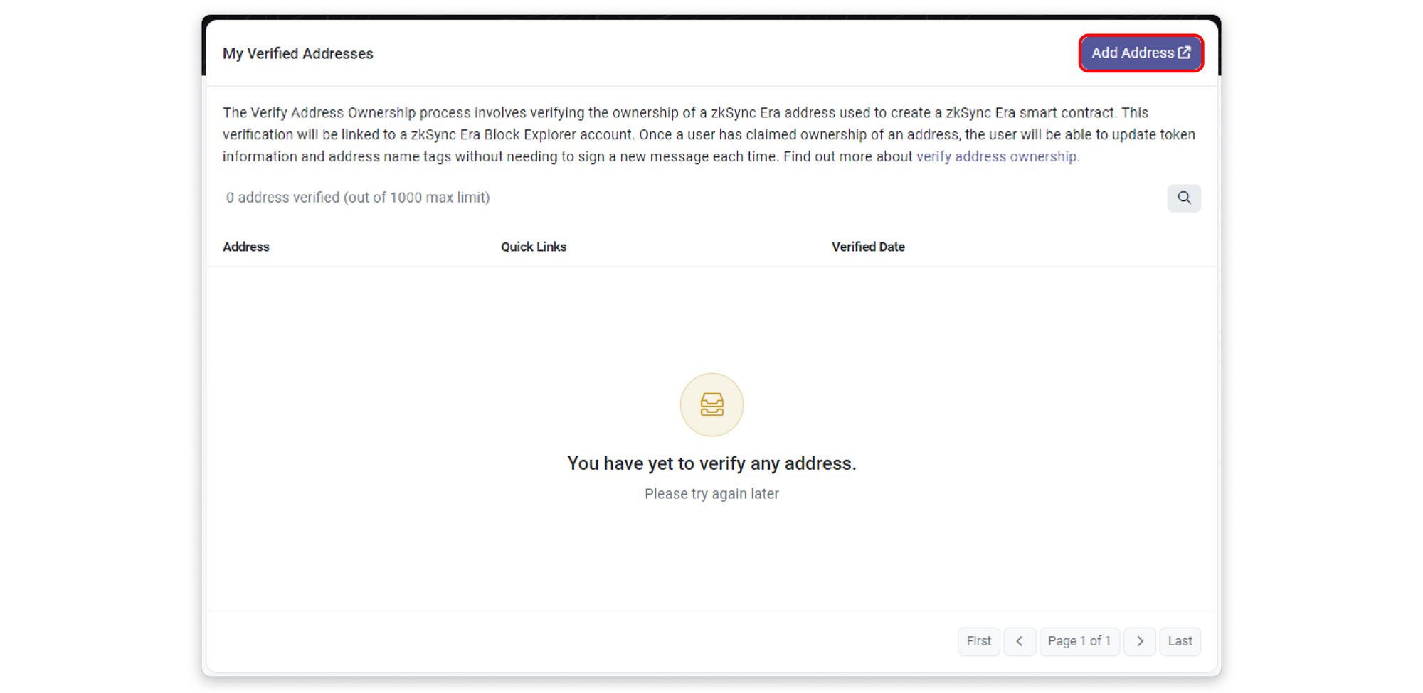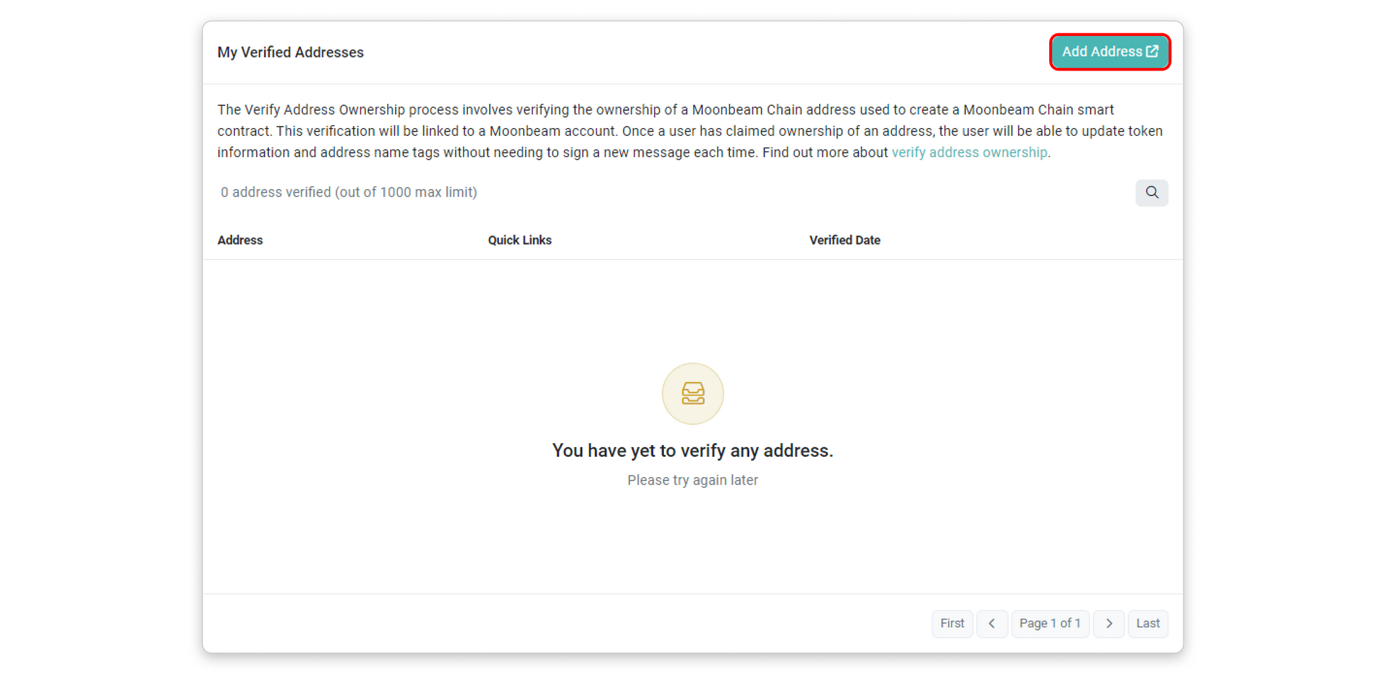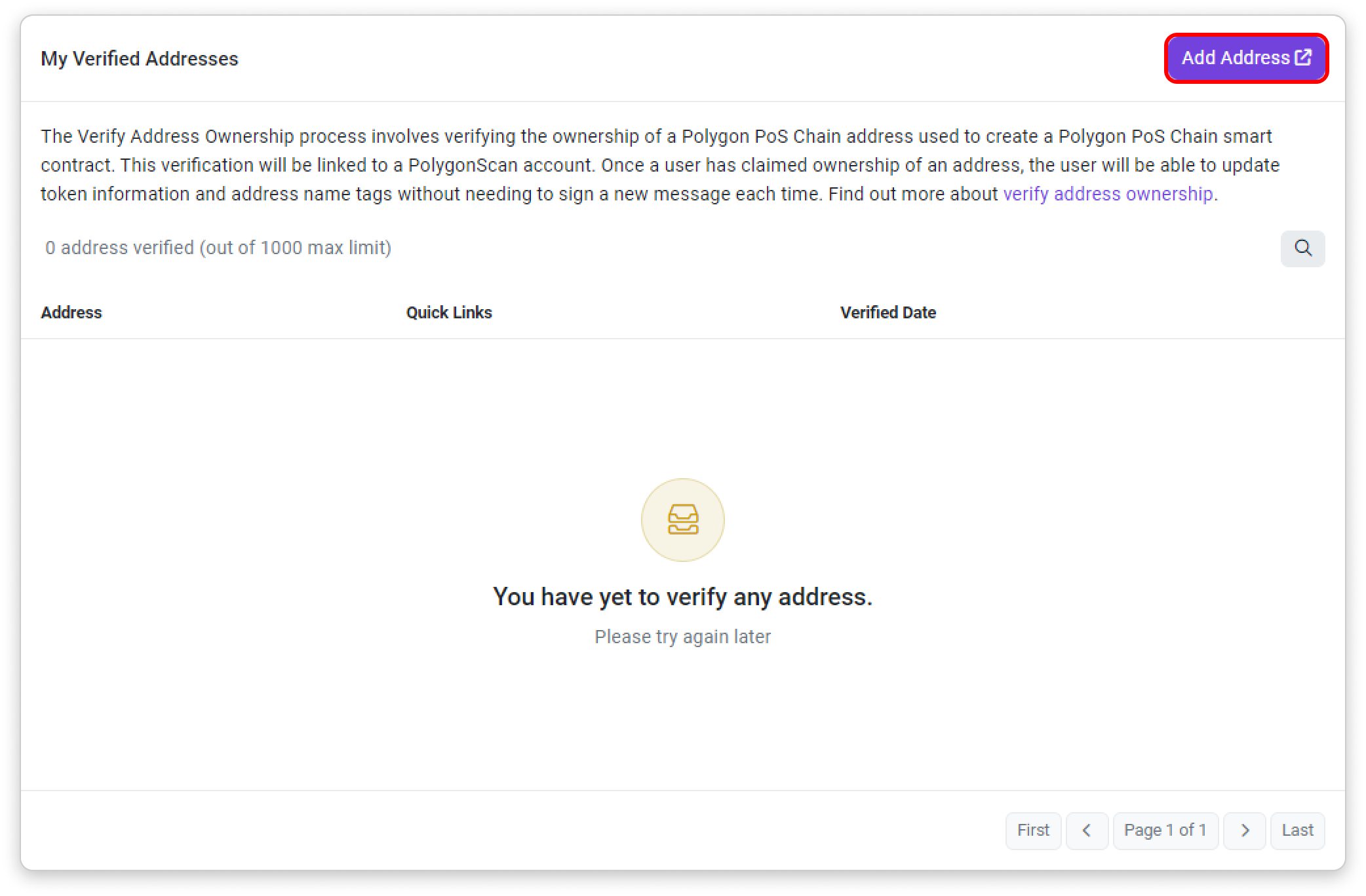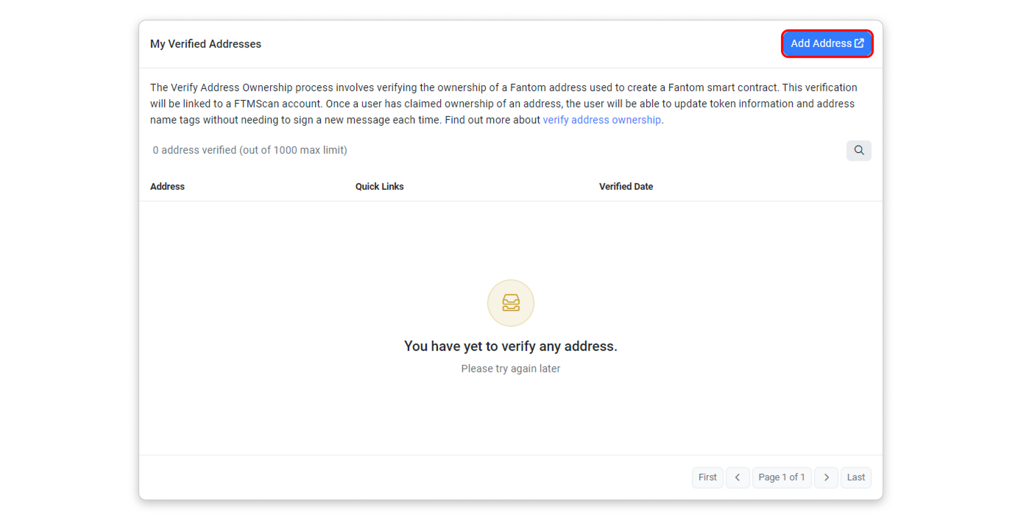 Step 3: The following page will show you how many contract addresses you have verified as yours and what actions you can perform with them. To claim ownership of a new contract address, click the Add Address button on the upper-right area of the page.