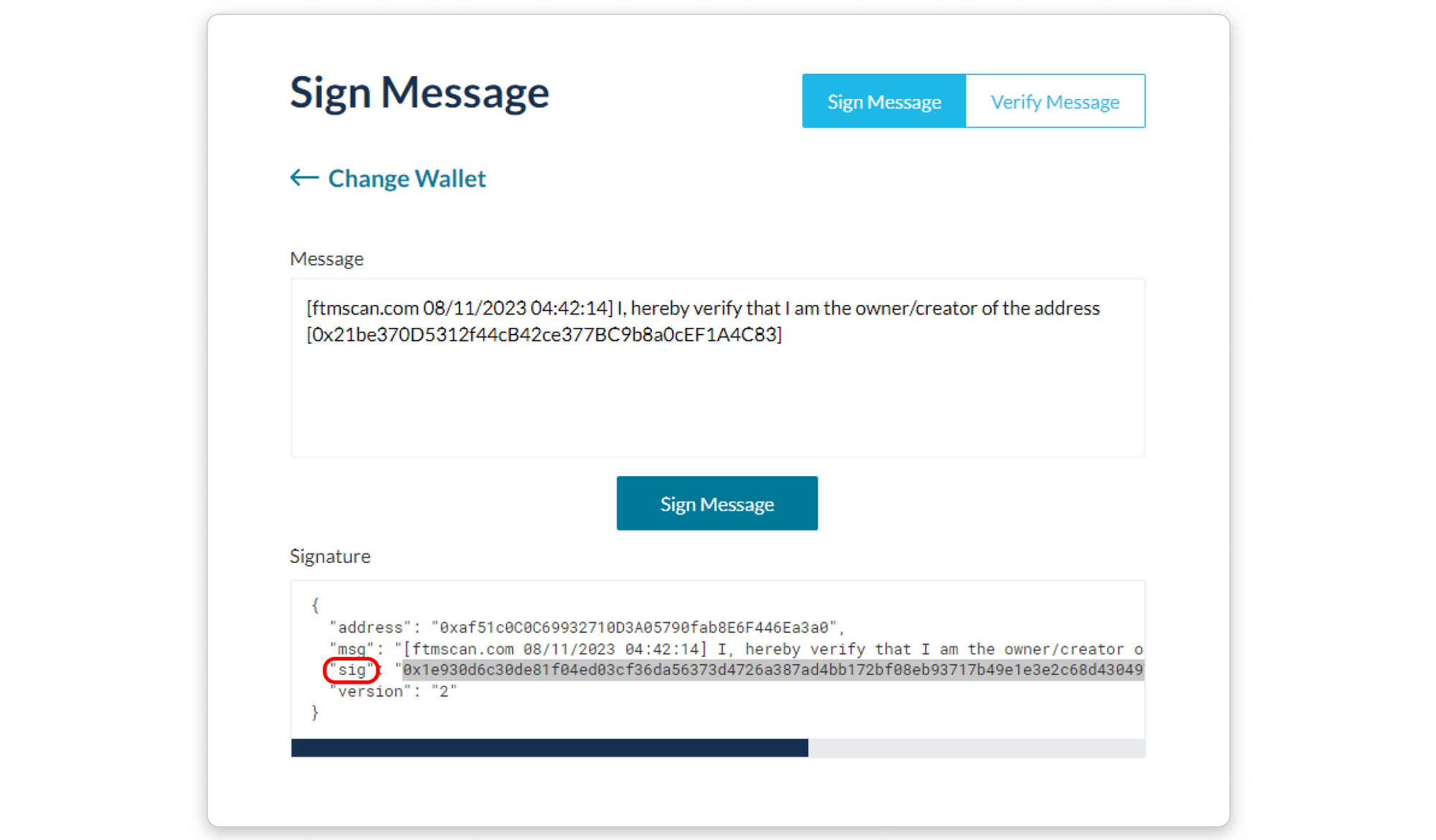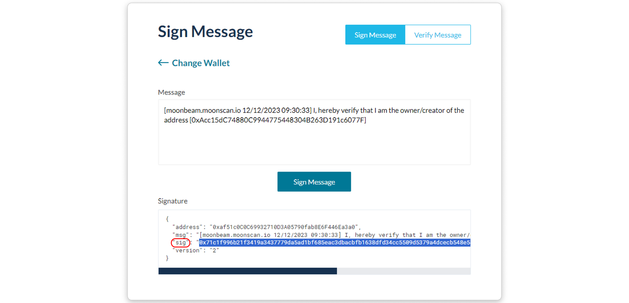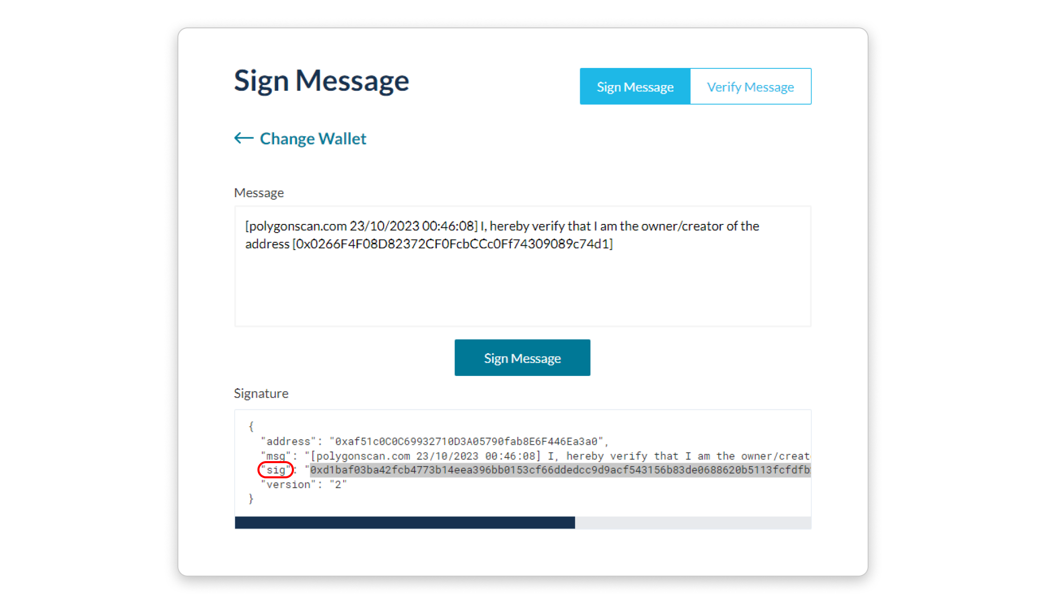 Step 4: After signing the message, another box will appear below the Sign Message button. This box contains the details of your signed message and the resulting signature hash. Inside the box, copy the value next to “sig”: and make sure to copy the entire string starting from right after the first “ and ending just before the last “ (or simply double-click on the string of characters to select and copy it)