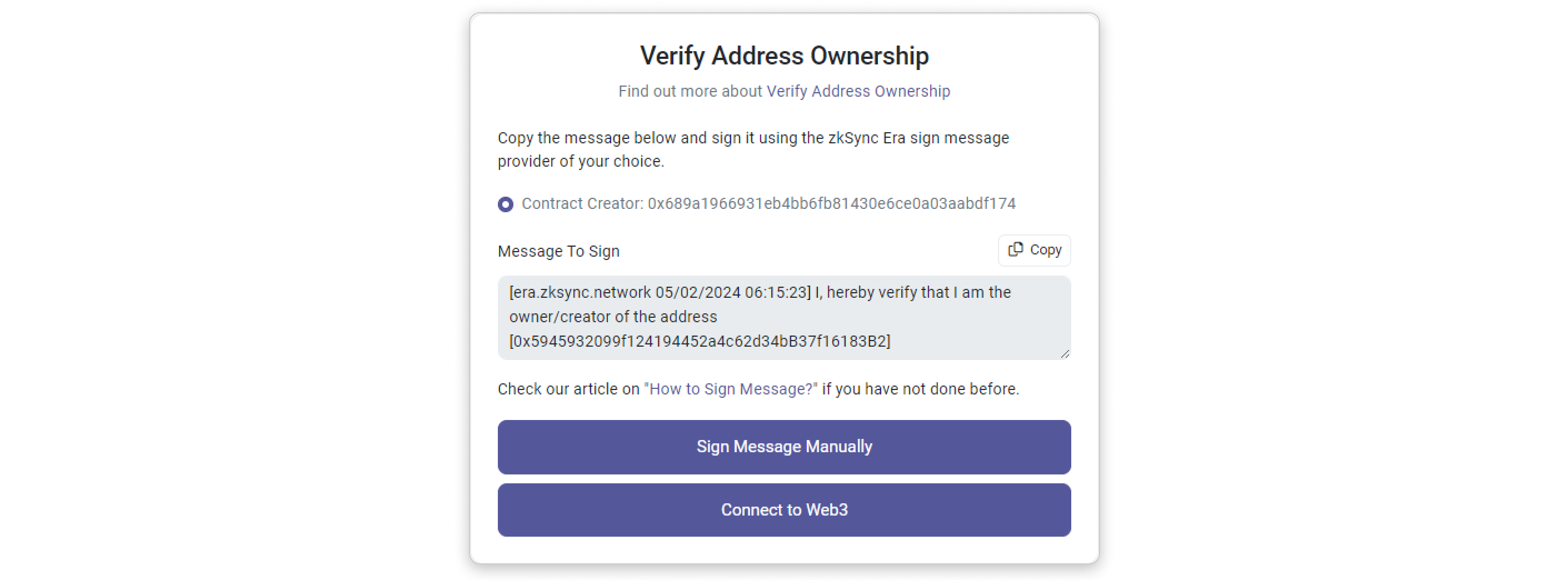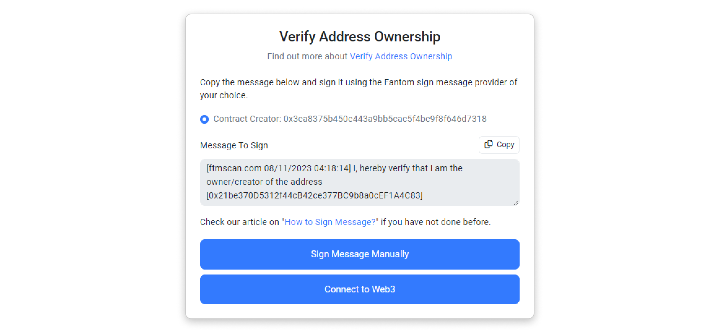 Step 5: You will be provided with options to sign the message with your wallet interface. You can either click on the "Sign Message Manually" button or sign with Web3 (Metamask).