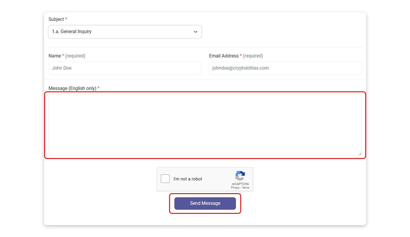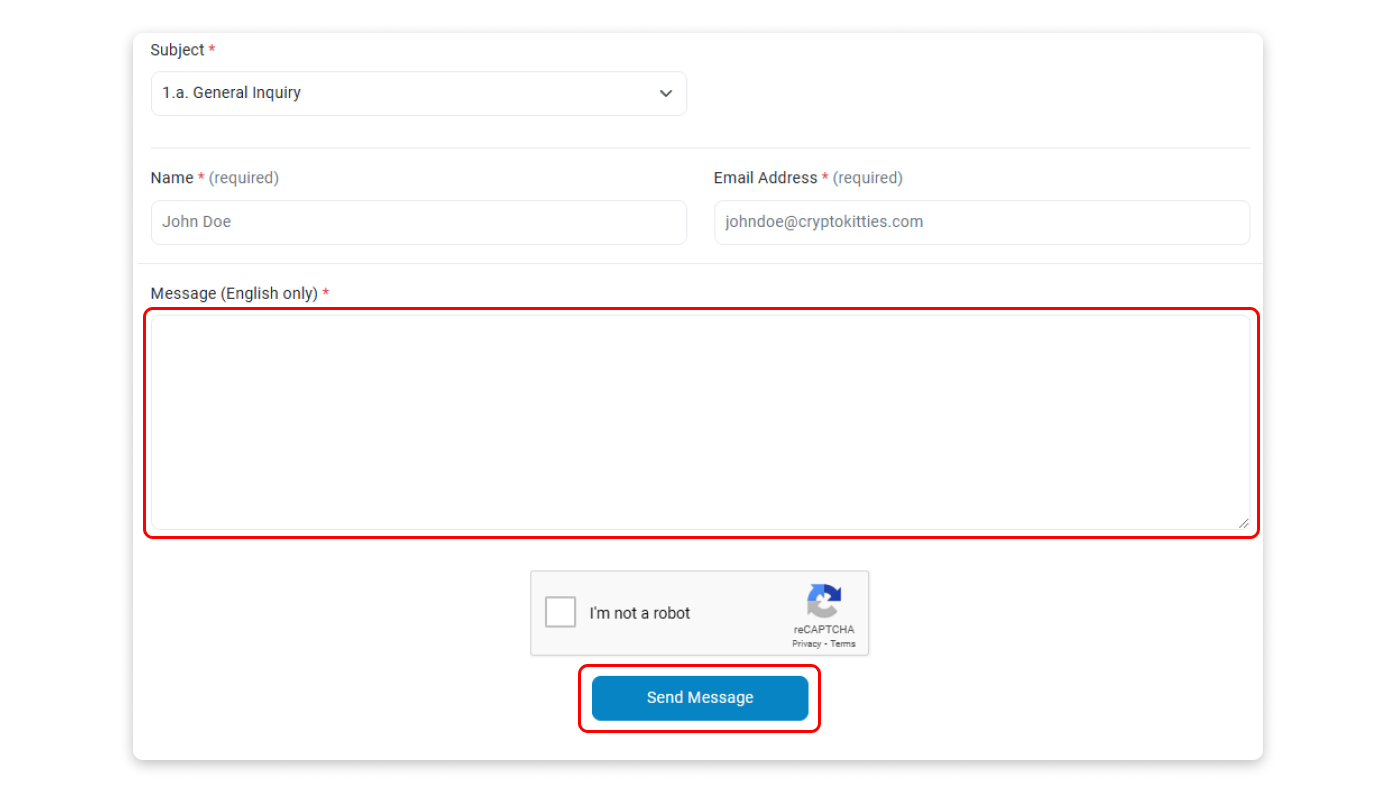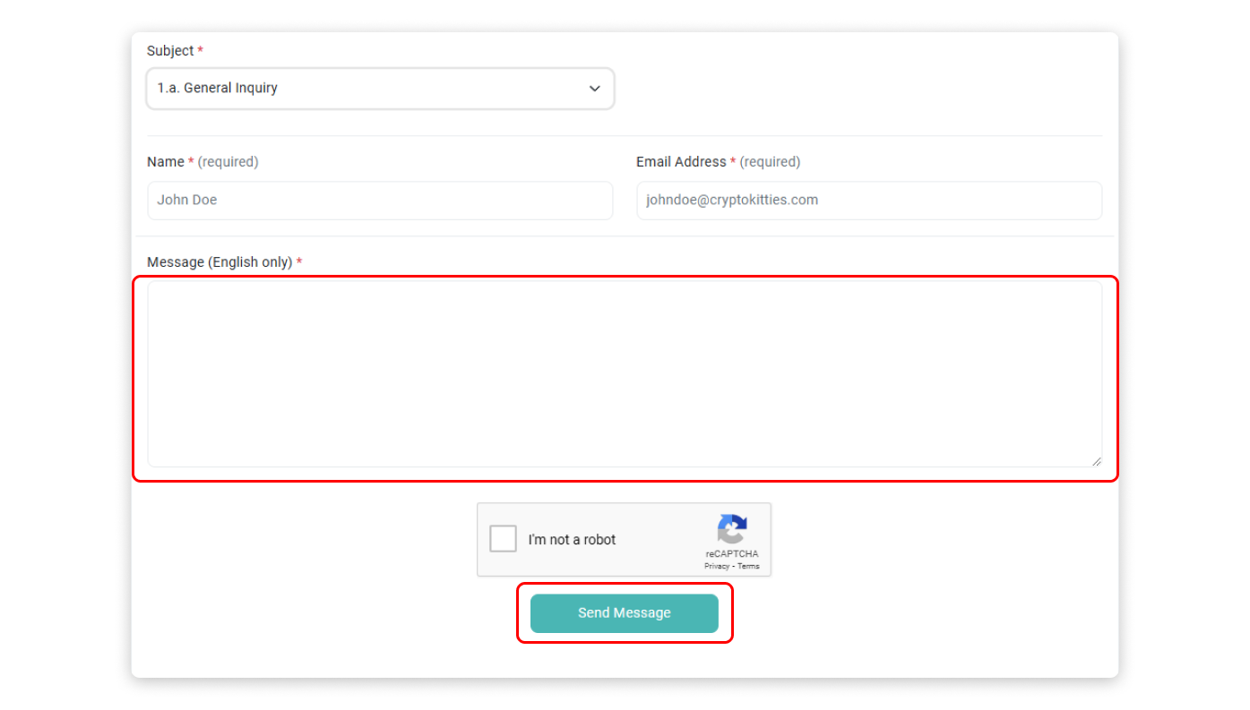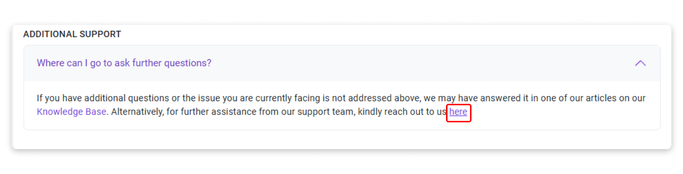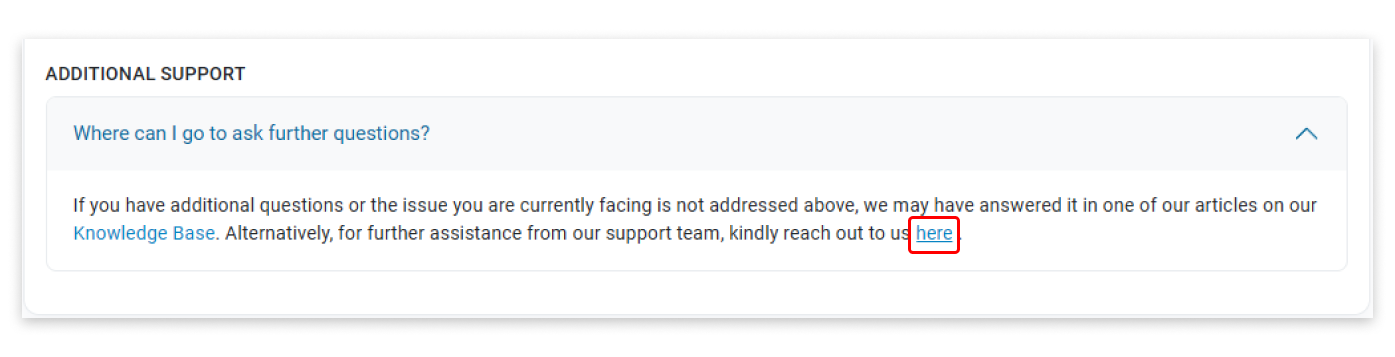 Step 1: Go to our Contact Us page and select "General Inquiry" as your message subject. Then, scroll to the bottom of the page and open the "Additional Support" snippet to view the second screenshot shown below. Finally, click on the link labeled "Here."
